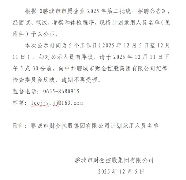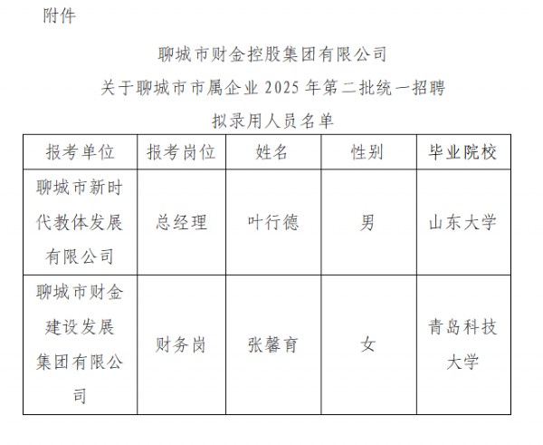 聊城市財(cái)金控股集團(tuán)有限公司關(guān)于聊城市市屬企業(yè)2025年第二批統(tǒng)一招聘公告擬錄用人員公示