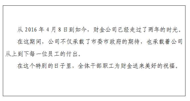 值此公司成立兩周年之際,讓我們全體干部職工不忘初心,不辱使命,團結一致,在張董事長的帶領下,進一步發(fā)揚敢于攻堅,善于克難,扎扎實實,團結能干的工作作風,為支持全市經濟社會發(fā)展,為落實市委市政府決策部署,為全市人民的民生福祉做出我們更大的貢獻,祝愿財金公司的明天更加輝煌。